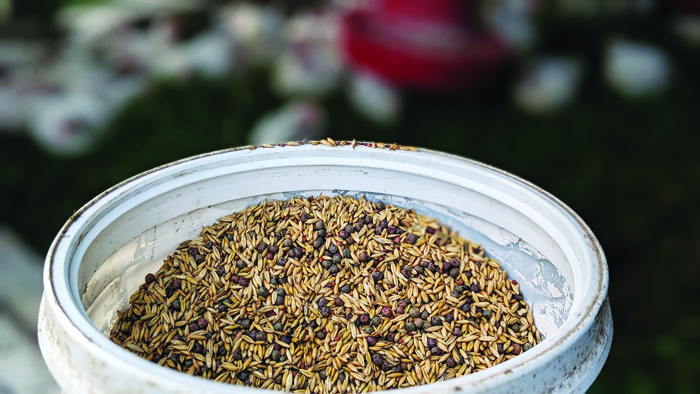 Oats. Oats are low-cost compared with the other seeds. They’re not as appealing to the chickens as corn, and they have a solid germination rate. Oats do a great job of filling in bare spots, and the green plants are palatable to cattle, so this has become a constant in my seed mixes.