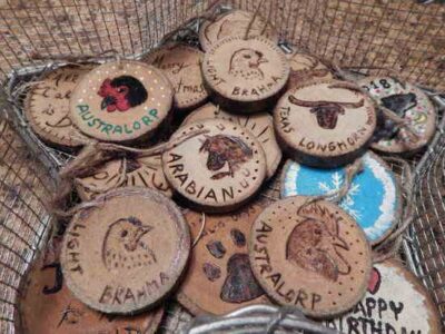 A variety of Christmas ornaments made from slices of wood, including different animal breeds.
