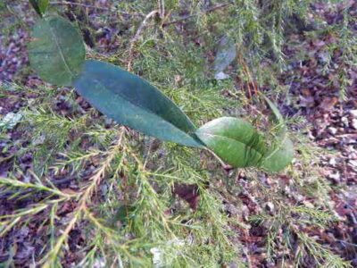 Simple Bay leaf garland wrapped around a “living” outdoor Christmas tree (Eastern Red Cedar).