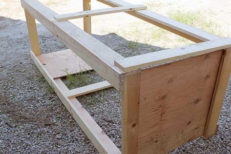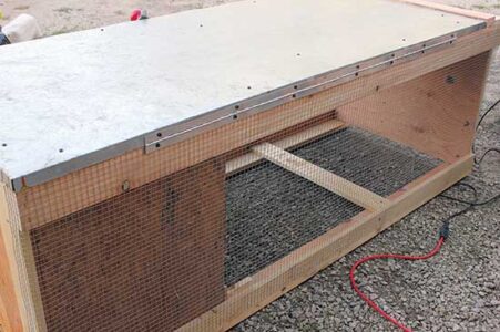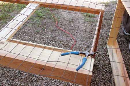 - With staples, attach the 2-by-3-inch welded wire to the bottom and cut it down so that it’s long enough to wrap up over the ends. Do the same with the 1⁄2-inch hardware cloth for each side.