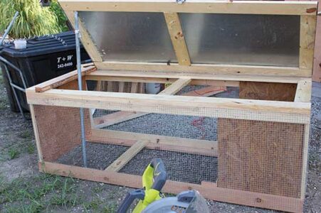 - Attach the metal to the wood frame with 1⁄2-inch screws and then attach the lid to the top of the rabbit tractor with a piano-style hinge.
