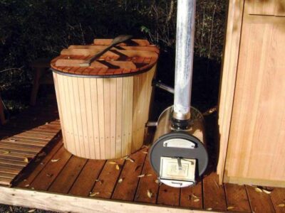 When choosing the location, also factor in whether the tub will be visible from your house or yard, and whether the setup will be attractive and blend into the landscaping. There should be a place for firewood and kindling next to the stove, and a place to hang your robe or clothing. If you plan to drain the water onto your garden, the tub needs to be at or above the elevation of your garden and needs a valve on the drain.