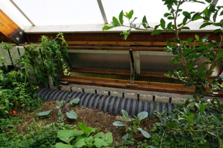 To overcome these and add extra capacity to thermal mass, there are more advanced systems to make mass more effective. The most common is store heat in the soil underground using a Ground to Air Heat Transfer (GAHT) system or climate battery. This system uses fans to circulate air underground and store heat in the soil underneath the greenhouse. It also takes advantage of the stable temperatures of the soil underground to provide year-round heating, cooling and some added air circulation / dehumidification. Running fans does take electricity, but the system as a whole can give you much more of an effect for heating and cooling than passive thermal mass alone.