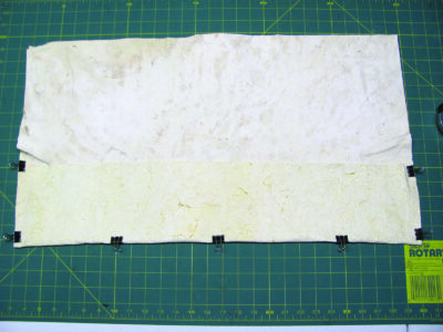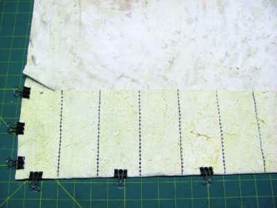 Unclip the leather and turn it over so it’s membrane-side up and the pocket flap is positioned at the bottom (or closest to you). Turn the pocket flap up; align the rows of holes that form the pockets, as when you punched them; and clip the flap in several places with binder clips. Using the artificial sinew, stitching needles, and a saddle stitch, sew each line of holes to form the individual tool pockets.