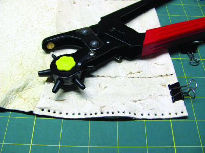 Using an awl or the four-hole punch and hammer, punch holes about 1/4 inch apart on the lines, through both layers of leather. Begin the holes about 1/4 inch up from the fold, and punch toward the top of each pocket. Don’t punch the holes on the right and left edges of the leather yet; leave that for later.