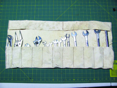 A flap at the top of the leather tool roll will prevent the tools from falling out when you’re carrying the roll to a work site. To make this flap, fold over the top 2 inches, and clip the flap into place. Saddle stitch this flap at both outside edges, and stitch one row down the middle.