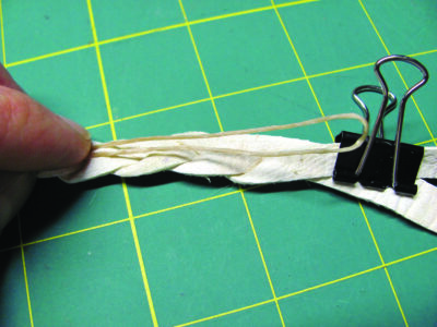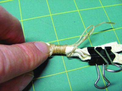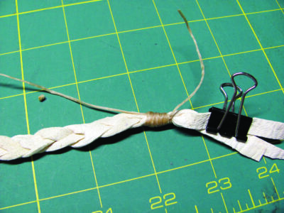 Bind the ends of the strap with a common whipping knot. Using the scissors, cut about 6 inches of artificial sinew. At one end of the sinew, form a loop about 2-1/2 inches long, and lay it on the braided strap so the loop is near the binder clip and the opposite end is about 2 inches from the binder clip.
