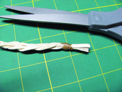 Cut the ends of the sinew close to the wrap. Then, trim the end of the braid. Finally, whip the opposite end, and trim. You can also use this type of whipping knot to keep the ends of natural fiber rope from fraying.